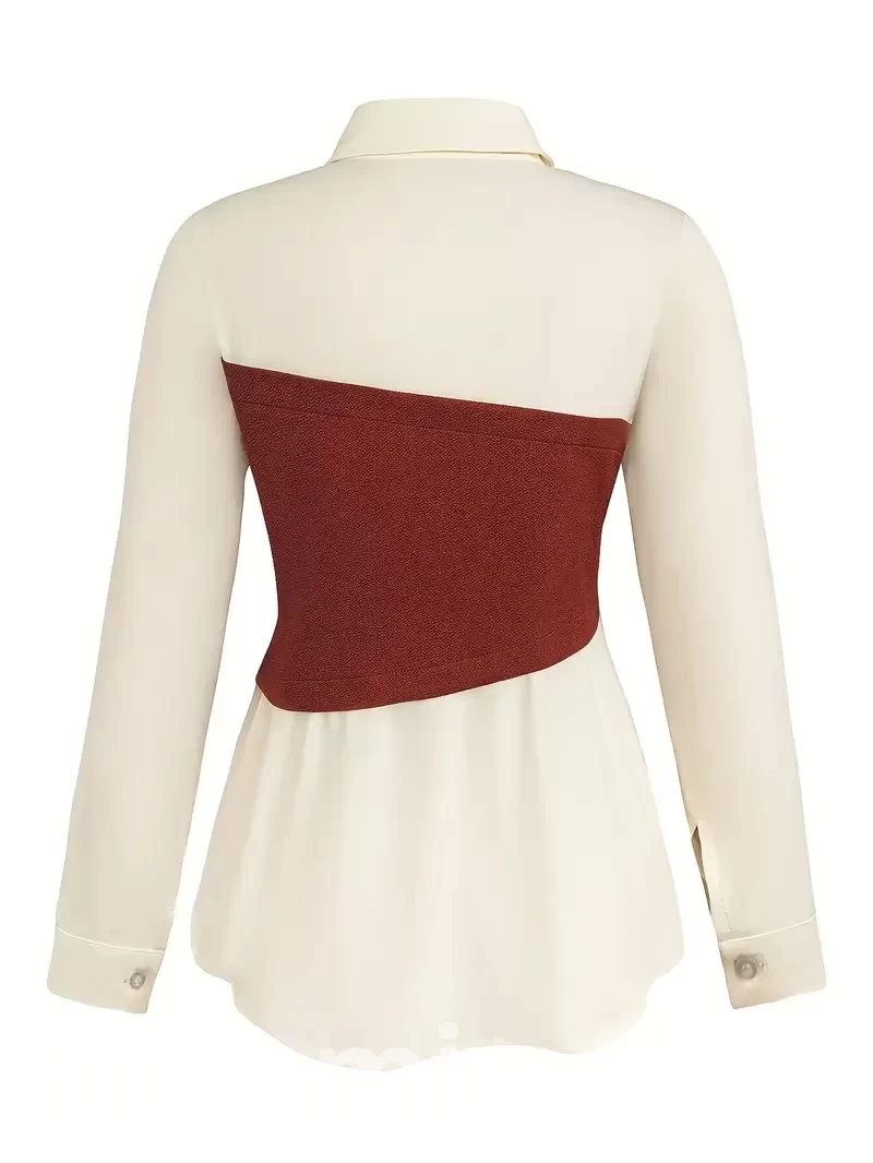 Step out in style with this chic two-piece set designed for the modern woman. Featuring a bold burgundy and white color-block design, this outfit combines elegance and comfort effortlessly. The button-up shirt adds a classic touch with its tailored fit and crisp collar, while the wide-leg pants provide a relaxed yet sophisticated vibe, perfect for both casual and formal settings.