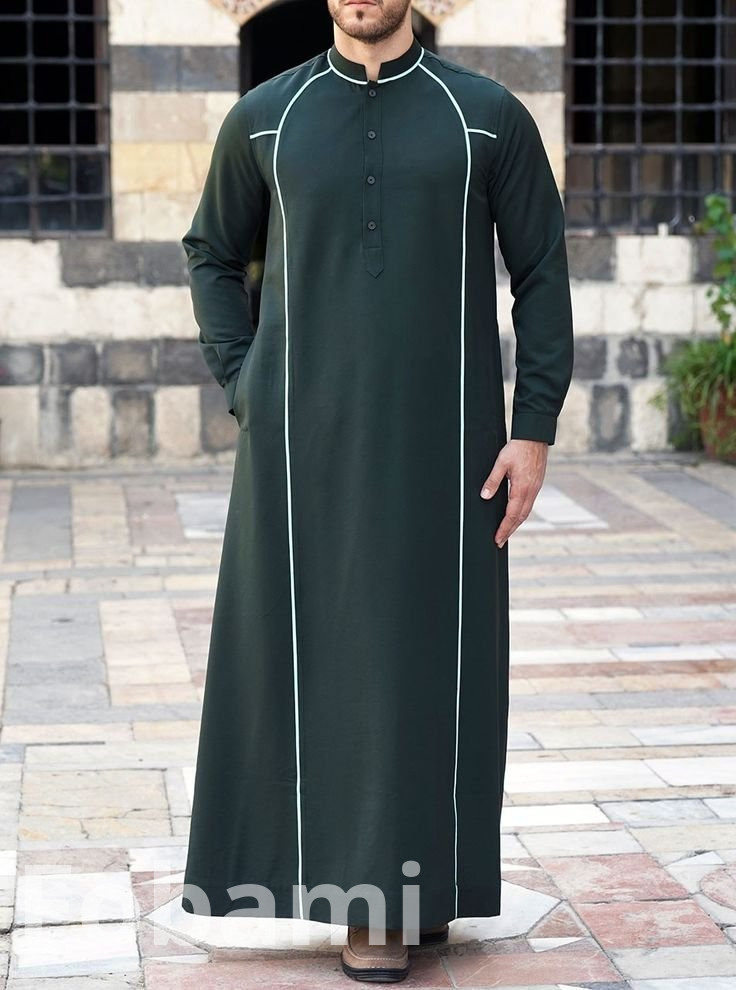 Step into elegance with our Men’s Stylish Contrast-Piped Jalabia. This premium jalabia features a sleek, long-flowing design enhanced by contrasting white piping, giving it a refined and modern touch. Crafted from high-quality, breathable fabric, it ensures maximum comfort for everyday wear, prayers, and special gatherings. The mandarin collar and buttoned front add a classic appeal, while the side pockets provide practicality. Whether for casual outings or traditional occasions, this jalabia is a perfect choice for the modern man seeking both style and modesty.